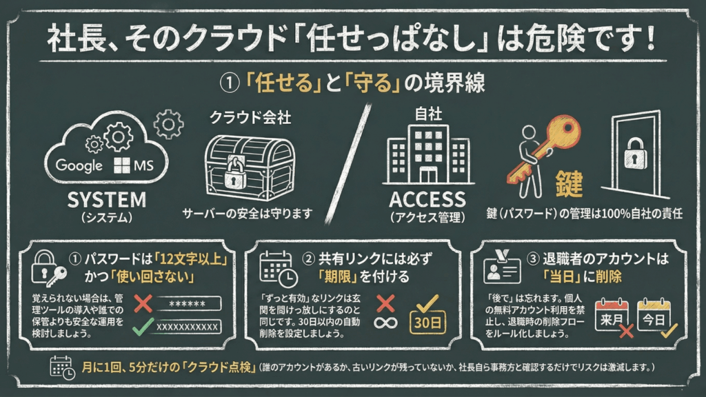 自社で守るべき『境界線』を正しく把握し、ルールを決める。それこそが、クラウドという便利な道具を、本当に安全な武器に変える唯一の方法です。